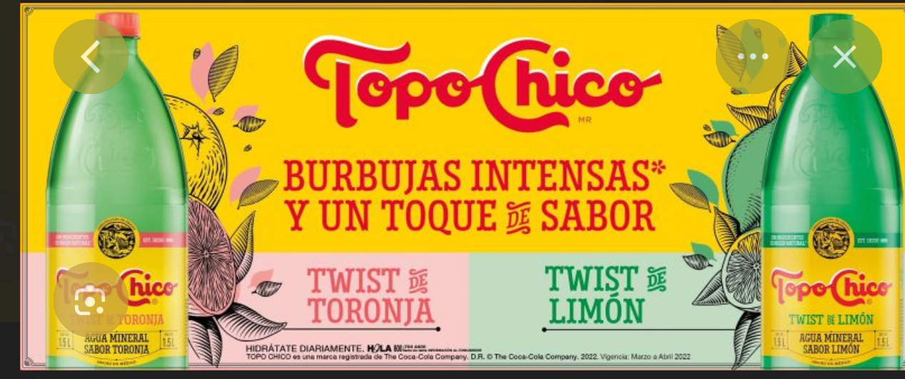 Disfruta la nueva versiΓ³n con un toque de toronja y limΓ³n que Topo Chico trae para ti. Topo Chico Twist Β tiene la misma personalidad autΓ©ntica de Topo Chico que ya conoces y mantiene esa deliciosa efervescencia. Es un agua mineral que te ayuda a refrescarte en dΓ­as calurosos ademΓ‘s de ser una alternativa saludable con un sabor agradable, ligero y sin calorΓ­as. Topo Chico es tu excelente acompaΓ±ante de tus comidas preferidas. CΓ³mpralo en lΓ­nea y te lo enviamos a casa.
