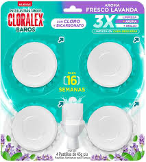 CLORALEX baños pastillas sanitarias para tanque son pastillas tipo in tank, las cuales bridan beneficios como poder de limpieza, espuma activa, ultrabrillo, larga duración, eliminación de malos olores. Además, debido a su contenido de cloro y bicarbonato, elimina bacterias como E. Coli y S. choleraesius.