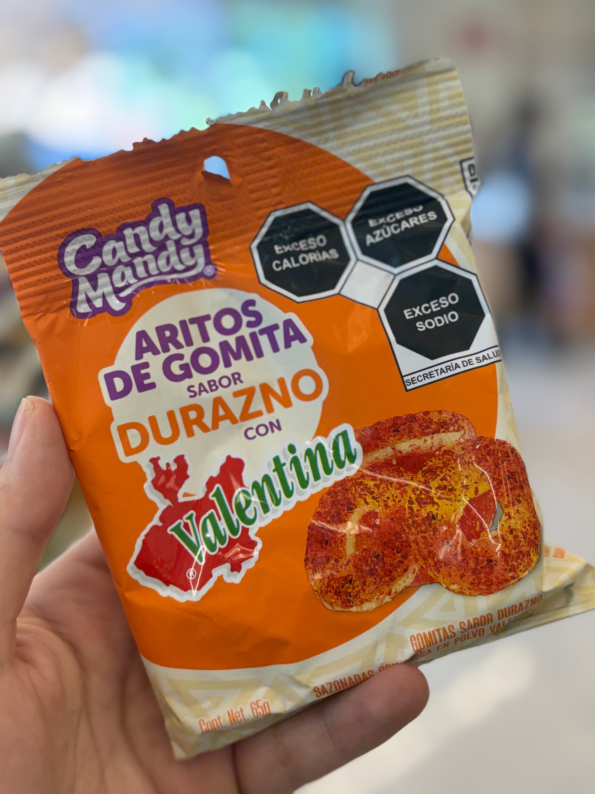 Aros de gomita sabor durazno sazonadas con polvitos sabor Valentina .
